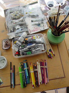 $1000 worth of watercolor tubes are always on hand. Much of watercolor painting involves putting pigment down and then removing some or nearly all of it while still wet- not very efficient but that’s how it is.