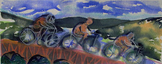 Cycling Across the Allegheny River, Watercolor and Gouache by Carol Skinger to be auctioned this coming Friday Dec. 7, 2018 Art of Cycling, A Benefit for Bike MS at the Wigle Distillery in the Strip District Pittsburgh MS fundraiser between 6:00 PM – 9:00 PM. Wigle Whiskey Distillery 2401 Smallman St, Pittsburgh, Pennsylvania 15222. Proceeds benefit the National MS Society, PA Keystone Chapter & Bike MS. Join us for cycling-themed cocktails, Blue Sparrow Food Truck and an auction of cycling-themed artwork by Pittsburgh artists including two paintings by me. They will be unveiling and auctioning the first-ever Wigle Whiskey cycling jersey, produced locally by Aero Tech Designs. Between now and then my two Art of Cycling paintings are on display with 2 others (one by Baron Batch) at Kindred Cycles, 2515 Penn Avenue in the Strip District.
